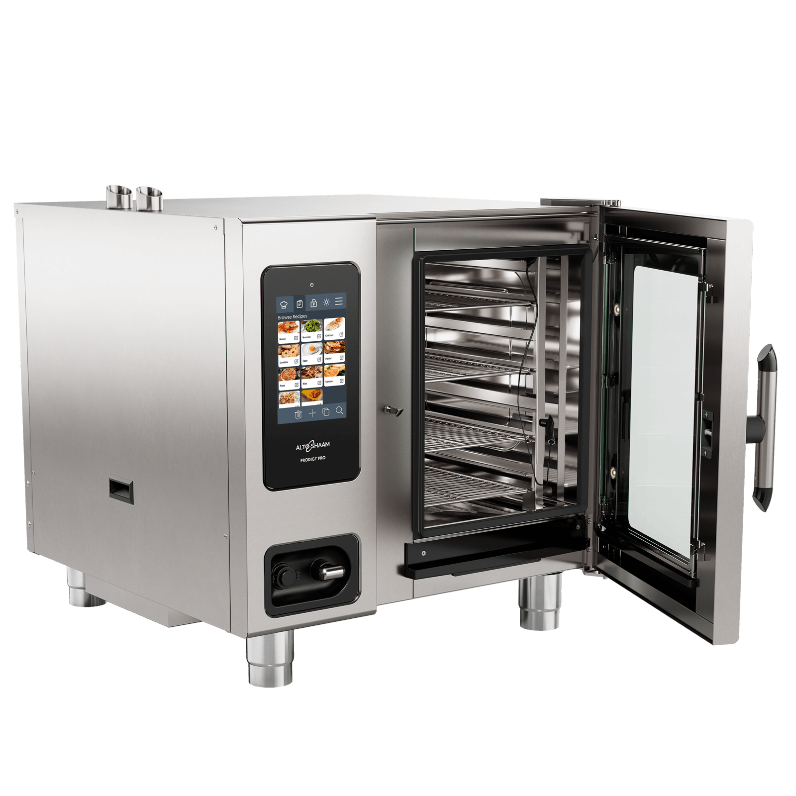 Alto-Shaam’s combi ovens combine multiple cooking functions into one efficient unit, ideal for diverse cooking needs. The Prodigy ovens feature a boilerless design, minimizing water usage by generating steam through water sprayed on a heated surface and circulated with fans. These versatile ovens can roast, smoke, steam, air fry, dehydrate, and bake, eliminating the need for other equipment, while a self-cleaning feature with convenient cleaning tablets increases employee productivity.